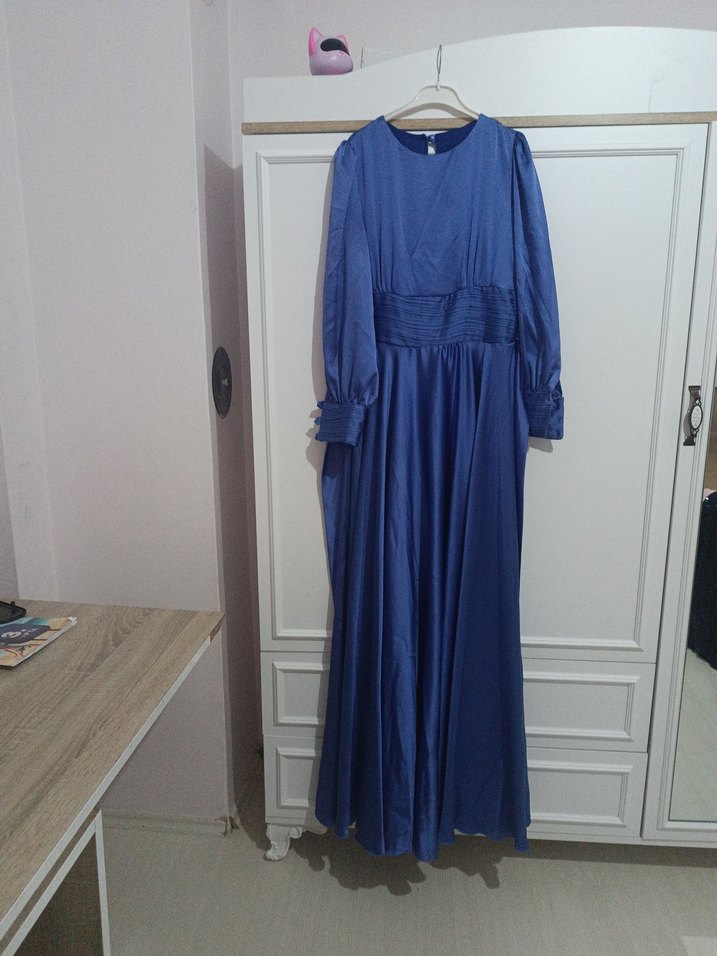 Lacivert, uzun kollu, bol kesim uzun elbise. İpek gibi parlak kumaştan, drapeli ve yuvarlak yakalı, vintage ve modern klasik tarzda günlük kullanıma uygun.