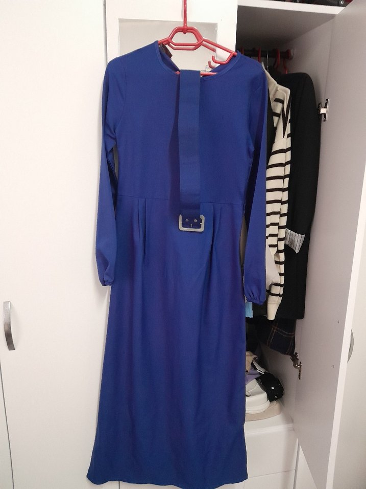Uzun Kollu Lacivert Kemerli Elbise