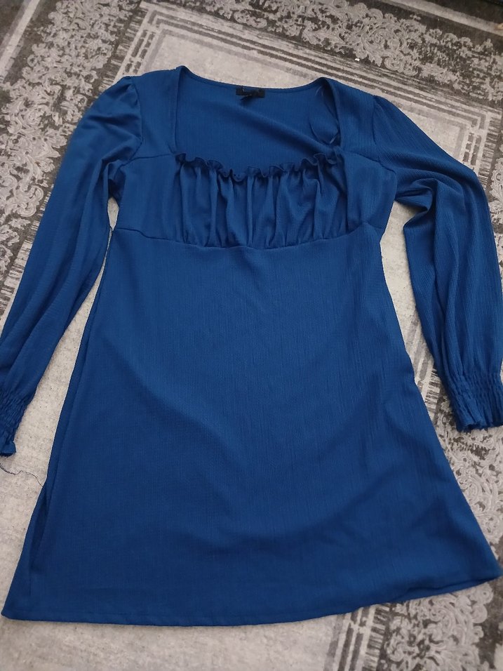 Lacivert midi elbise, uzun kollu ve fırfırlı kayık yaka detayına sahip. Yumuşak keten kumaştan, vücuda oturan kesimli, rahat ve bohem tarzda. Günlük kullanıma uygun.