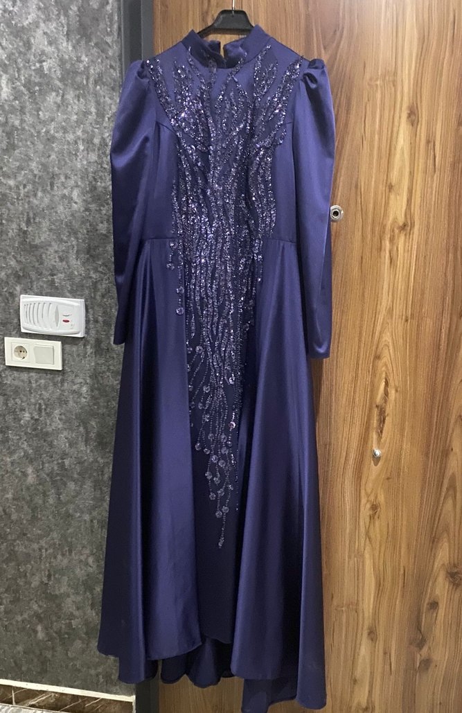 Uzun Kollu lacivert Nakışlı Abiye Elbise şal dahil