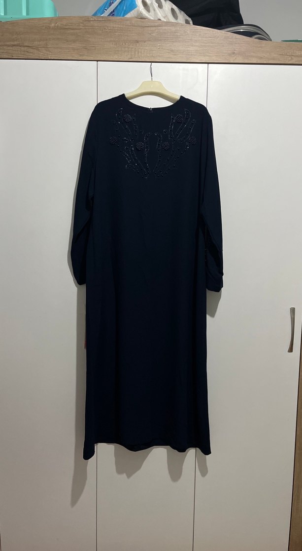 Uzun kollu, yuvarlak yakalı lacivert , nakış detayları ve dökümlü, bol kesim bir elbise