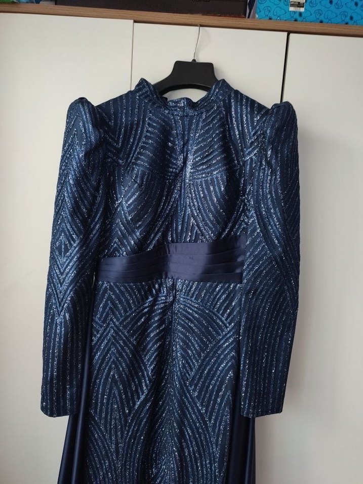 Bu uzun, dar kesim abiye elbise pilili detaylara ve yüksek yakaya sahiptir. Parlak lacivert kumaşıyla partiler için göz alıcı bir şıklık sunar. Uzun kolludur ve modern klasik stilde tasarlanmıştır. ✨