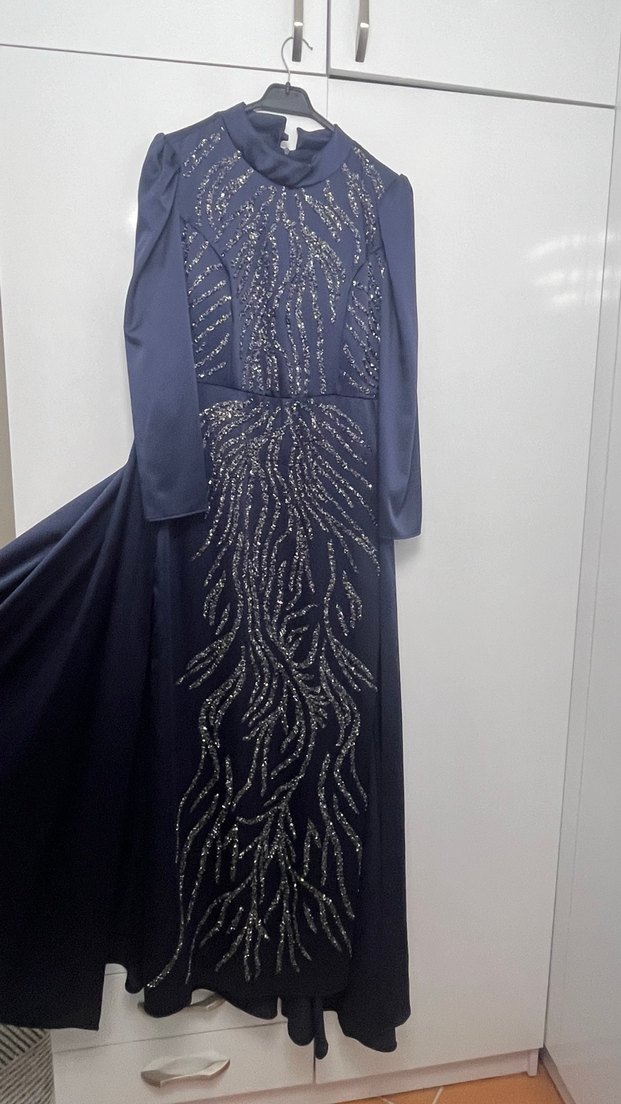 Lacivert uzun kollu abiye elbise, yüksek yakalı ve payet işlemeli desenlere sahip. Düzenli kesim, çağdaş stil, düğün için uygun. ✨ kuru temizlemeye verildi bi saat giyildi 2 metre şal ile birlikte verilecek