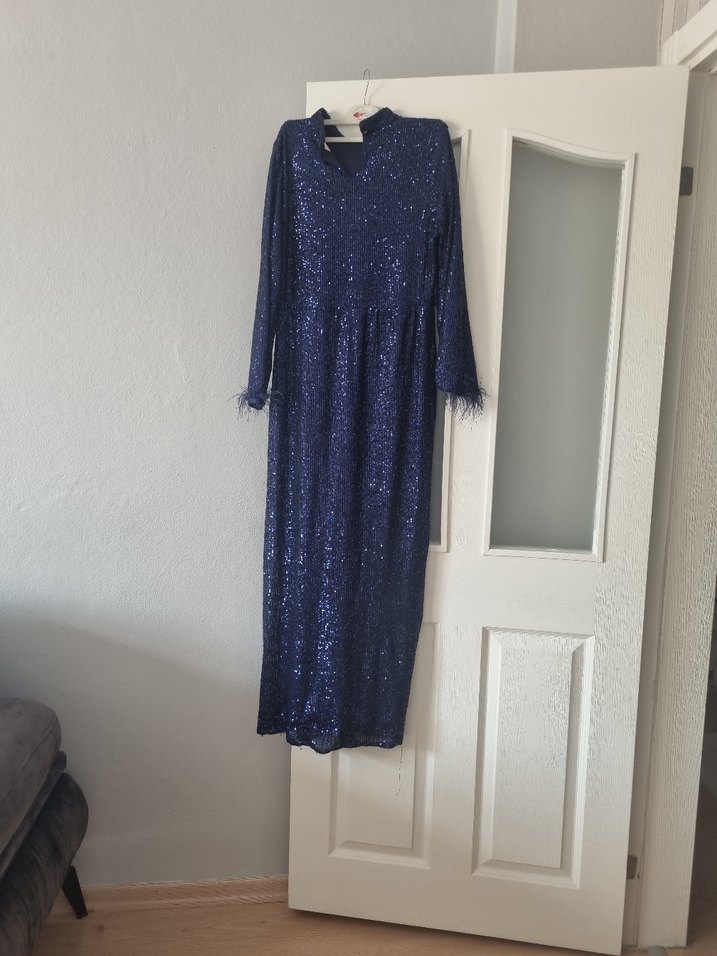 Bu uzun, dar kesim abiye elbise, lacivert payetlerle süslenmiş uzun kollara ve modest bisiklet yaka detayına sahiptir. Bohem tarzda, şık davetlere uygundur. ✨