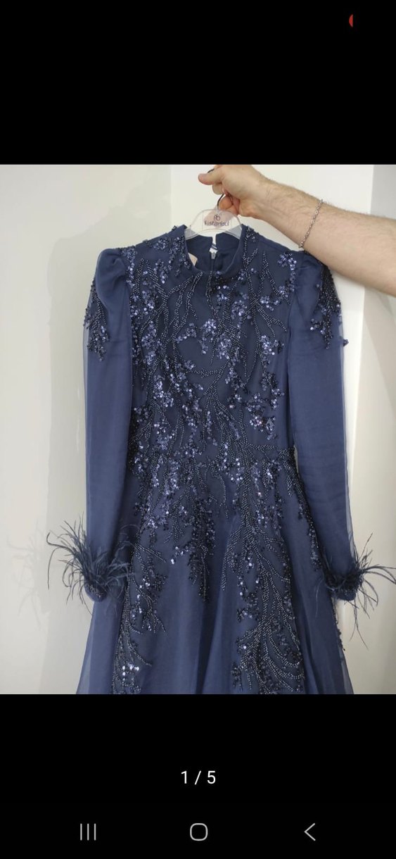 Uzun kollu, yüksek yaka ve payetli işlemeli desenlere sahip lacivert, vücuda oturan abiye elbise. Manşetlerde tüy detayları klasik zarafet katıyor. Abiye yalnızca bir kere nişanda giyildi.