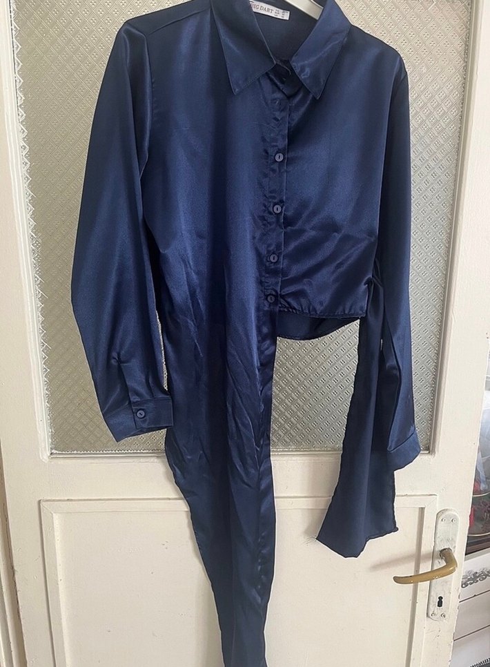Uzun kollu, düğmeli ve yakalı bu gömlek, parlak mavi saten kumaştan loose fit olup ofis ve Paris sokak stiline uygundur.