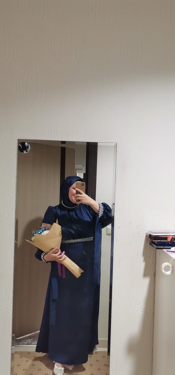 Uzun kollu, yüksek yakalı ve inci detaylı lacivert mezuniyet elbisesi, bir kere giyildi 44 46 beden uyumlu özel dikimdir aynı kumaştan eşarbıyla beraber gönderilecektir