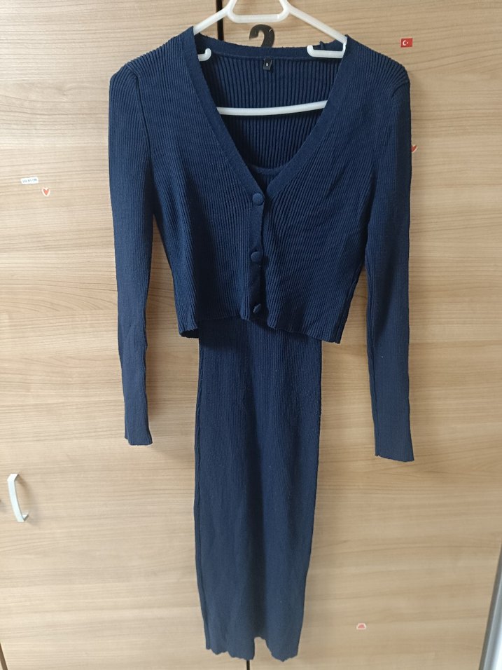 Dar kesim, uzun boylu triko elbise uzun kollu ve yakasında kesik detay bulunur. Koyu mavi triko kumaşıyla minimalist, normcore tarzda günlük kullanıma uygundur.