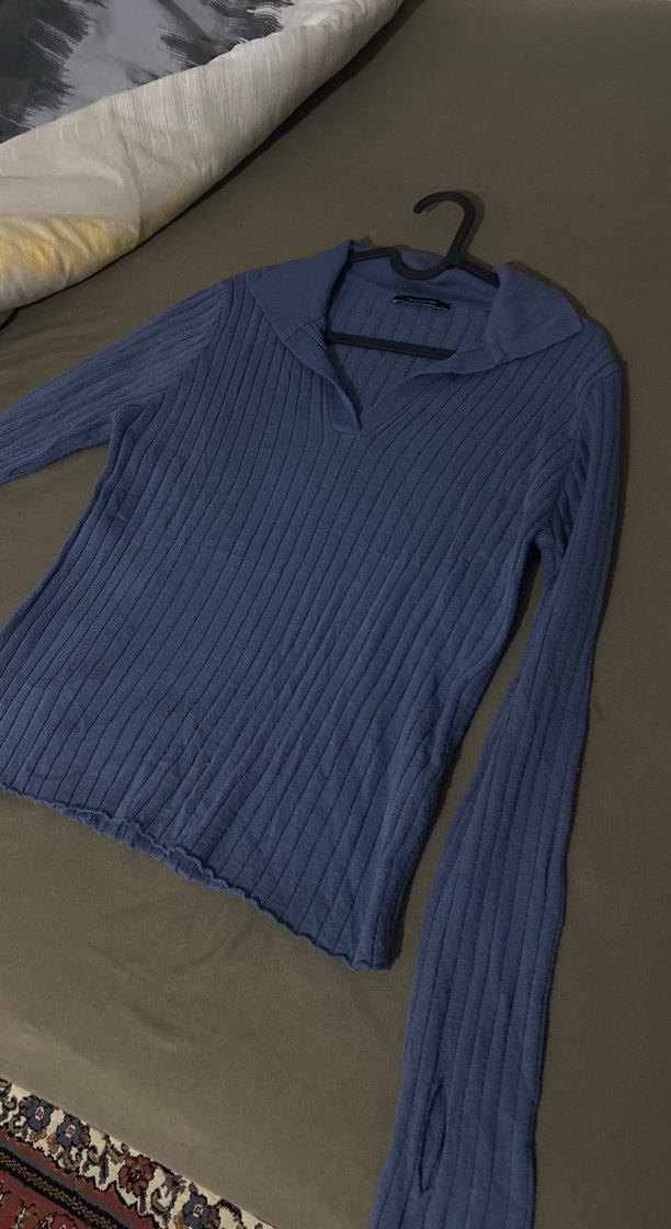 Lacivert renkli, uzun kollu, yakalı ve triko dokulu kadın kazak. Yumuşak keten kumaştan üretilmiştir, gündelik kullanıma uygundur. Yarım el detaylı