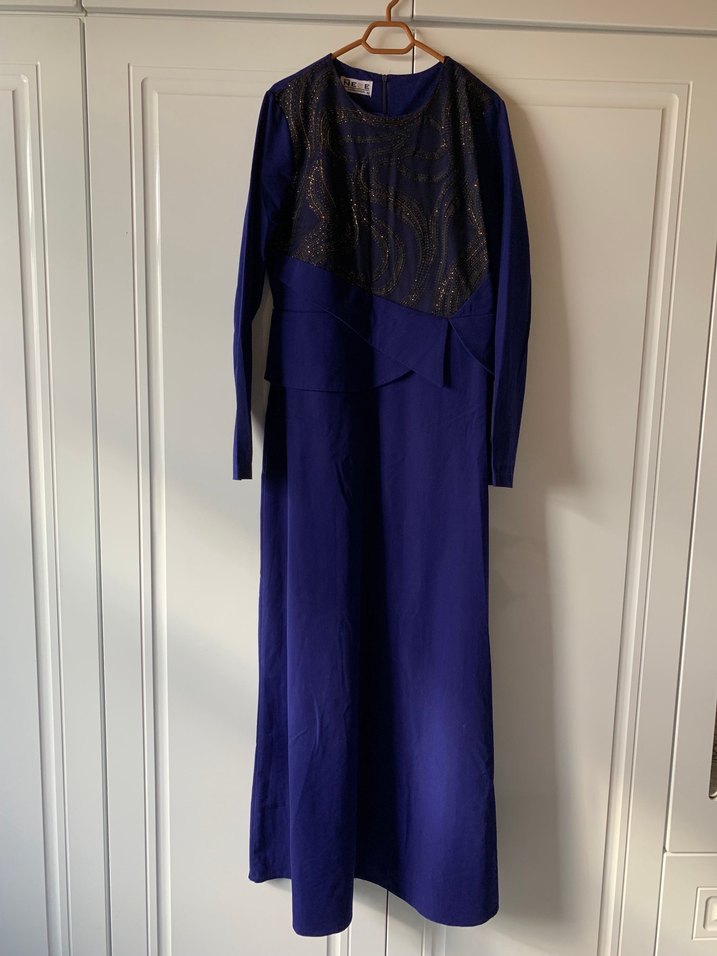 Uzun kollu, bol kesim bu elbise, satenimsi kumaştan yapılmış ve drapeli detaylara sahip. Koyu lacivert renk ve avangard bohem tarzıyla günlük kullanıma uygundur.