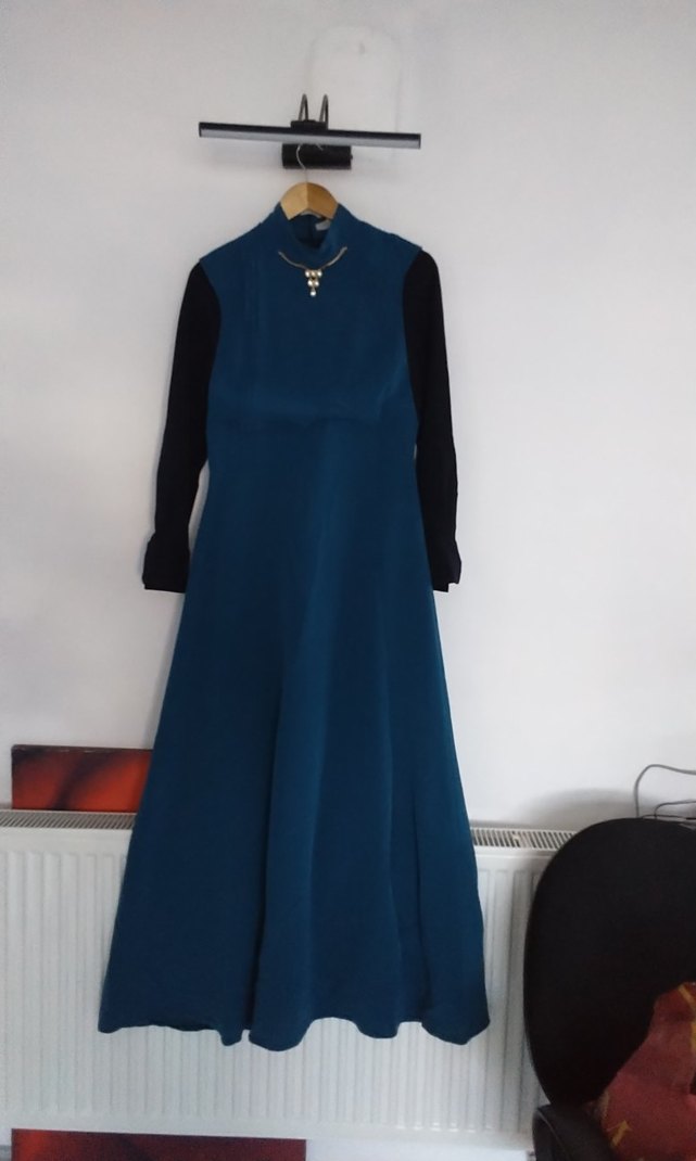 Uzun kollu, yüksek yakalı bu lacivert elbise, yumuşak ve sıcak kumaştan yapılmıştır. Drapeli tasarımı ofis kullanımı için uygundur, gotik tarzı yansıtır. ✨