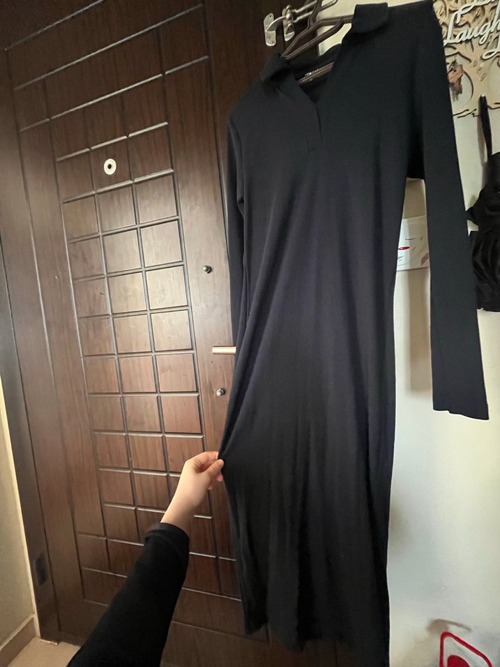 Dar kesim Lacivert uzun elbise, uzun kollu ve yırtmaçlıdır. Yumuşak sentetik kumaştan üretilmiş, minimalist tarzda ve günlük kullanım için uygundur. sadece 1 kez giyildi tertemiz s bedene de uyumludur.