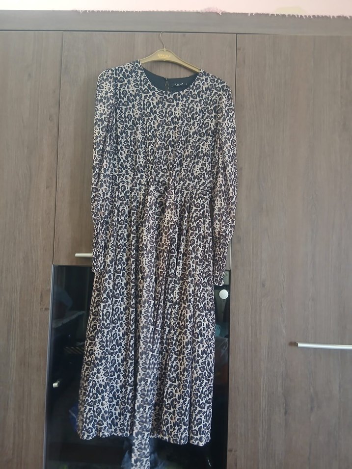 Uzun, bol kesim elbise, uzun kollu ve yuvarlak yakalıdır. Yumuşak sentetik kumaştan üretilmiş, pilili ve kahverengi-gri leopar desenlidir. Hiç Giyilmedi Sorunu yok
