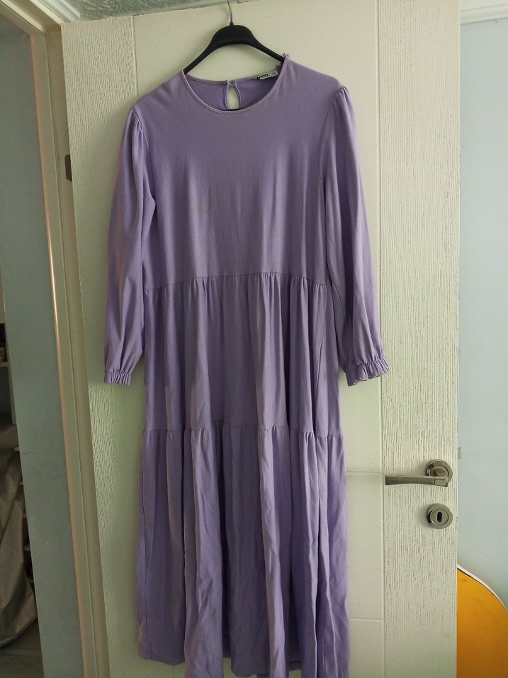 Pastel lila renkte, bol kesim ve pile detaylı uzun elbise. pamuklu kumaştan, uzun kollu ve yuvarlak yakalı, minimalist ve retro tarzda.