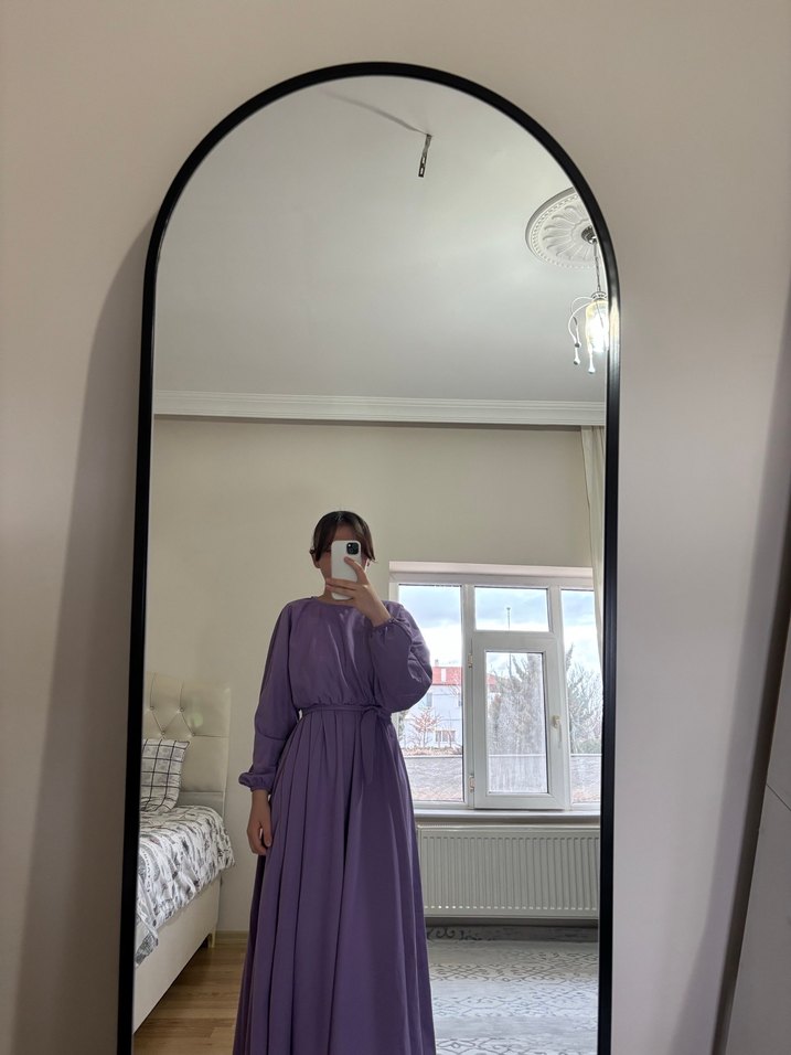 Mor pastel tonlarında, ipeksi dokulu, uzun kollu ve yüksek yakalı salaş uzun elbise. Dökümlü tasarımıyla sade ve mütevazı bir görünüm sunar. A kesim elbisemizin kemer detayı bulunmakta olup beli ve kolları lastikli olmasıyla kolay bir kullanım sağlar.