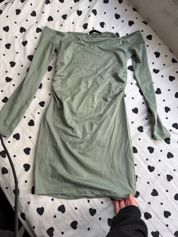 uzun kollu ve madona yakalıdır. Yumuşak sentetik kumaştan yapılmış, gri-yeşil tonlarında, romantik akşamlar