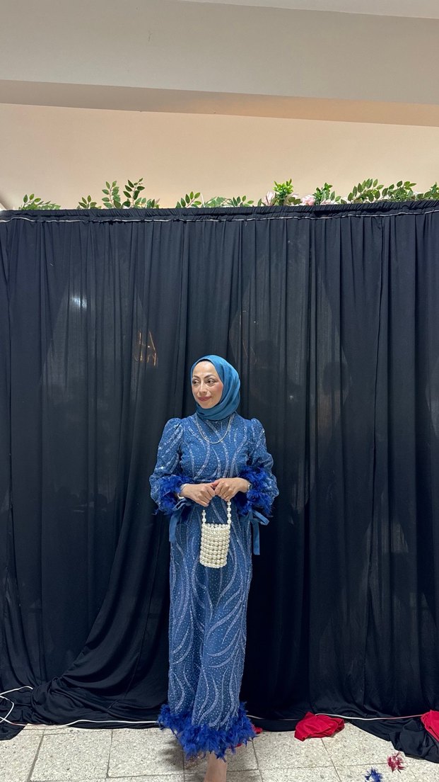 Uzun Kollu Mavi Bağlamalı Uzun Elbise