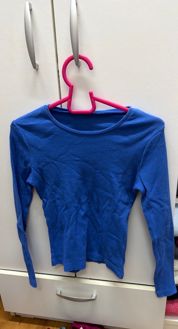 Uzun kollu, bisiklet yaka ve vücuda oturan mavi kadın kazak, günlük kullanıma uygun sade ve renkli sokak tarzı sunar.