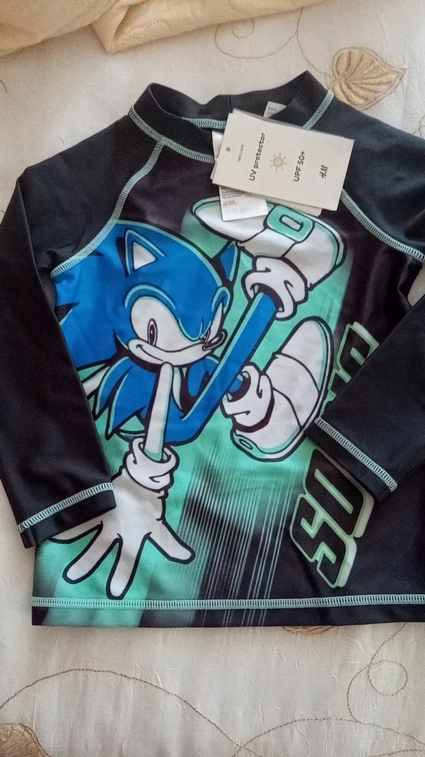 Dar kesim uzun kollu erkek tişörtü, yuvarlak yaka ve canlı Sonic baskısıyla. Sentetik kumaştan, cırt cırt detaylı, deniz için ideal