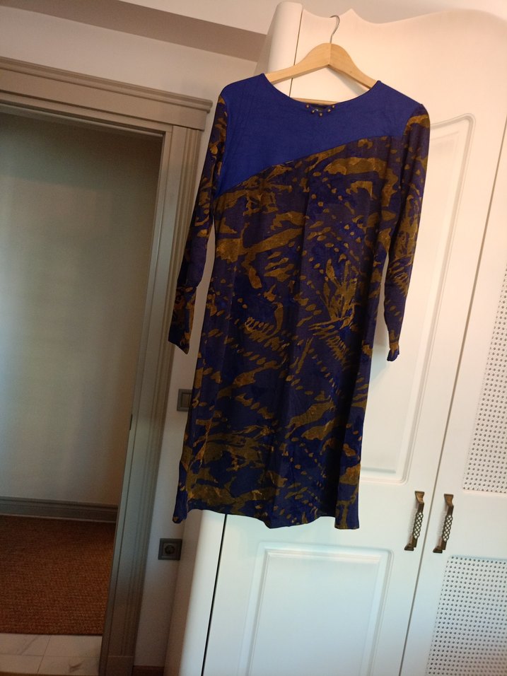 Uzun, bol kesim, mavi batik desenli bu tunik, drapeli tasarımı ve yuvarlak yakası ile bohem stilini günlük rahatlıkla buluşturuyor.