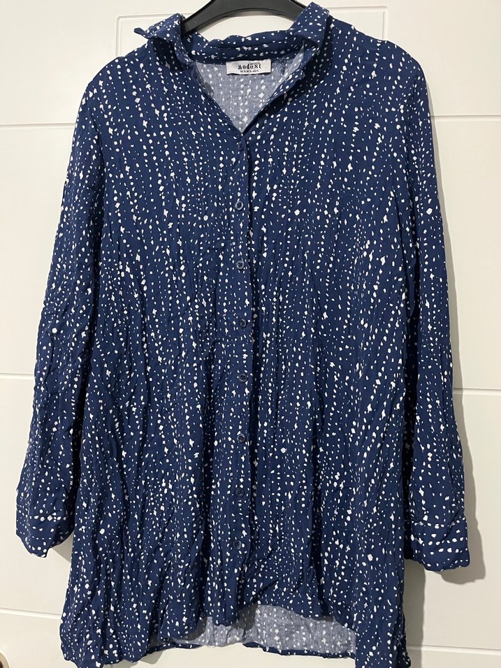 Kadınlar için uzun kollu, düğmeli ve yakalı gömlek. Keten kumaştan, koyu mavi batik desenli, bol kesim ve uzun boyda, rahat sokak stiline uygun.