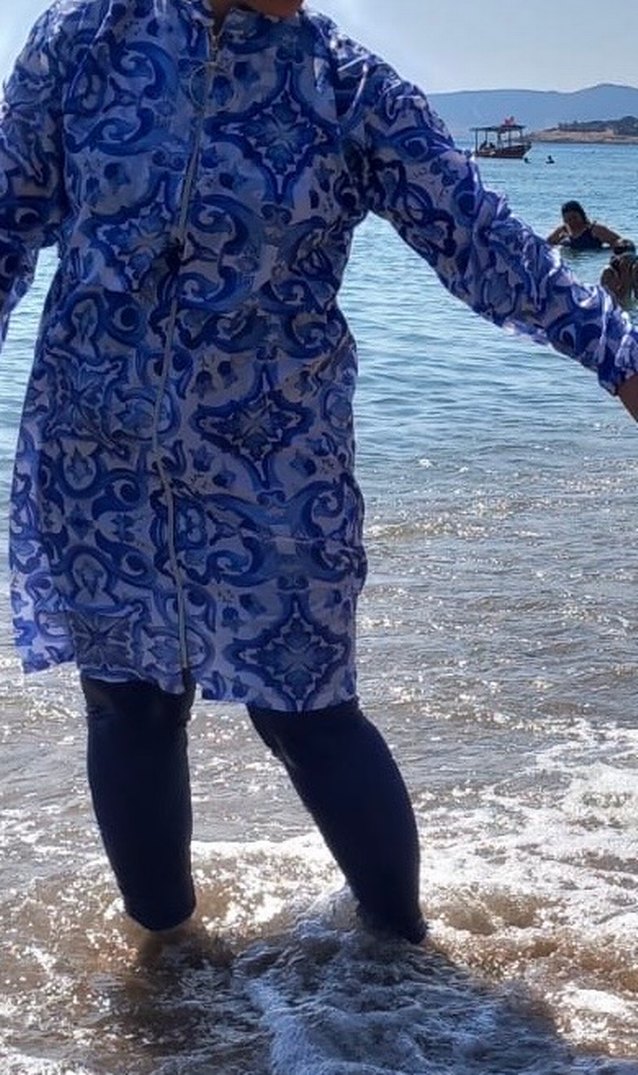 Uzun Kollu Mavi Batik Desenli Kadın Plaj elbisesi