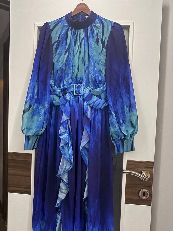 Yüksek yakalı, uzun kollu, bol kesim bu uzun elbise koyu mavi tonlarında batik desenli, drapeli ve kemerli. Bohem ve avangart stil karışımı 40 42 beden uyumlu pazarlık payı vardır.(hiç giyilmedi!