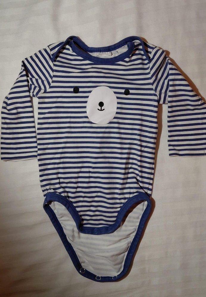 Uzun kollu, yuvarlak yaka, pamuklu bebek body. Mavi beyaz çizgili ve ayı yüzü desenli, düğmeli kapanışlıdır.
