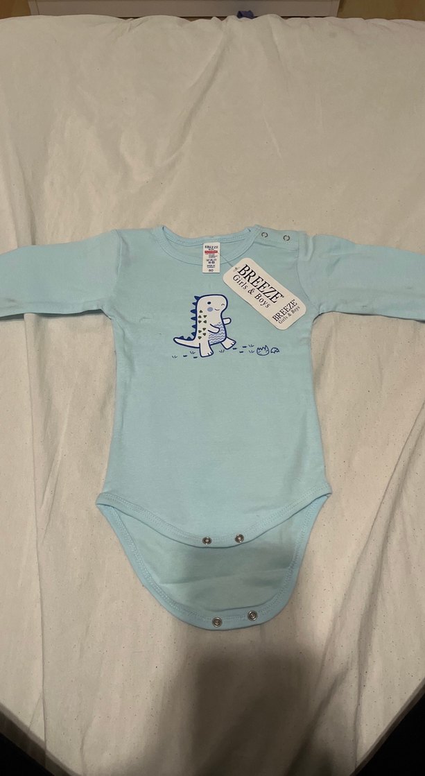 Pastel mavi renkte, uzun kollu, yuvarlak yakalı ve baskılı dinozor desenli bebek body. Yumuşak ve sıcak kumaştan, çıtçıtlı kapanışlı.