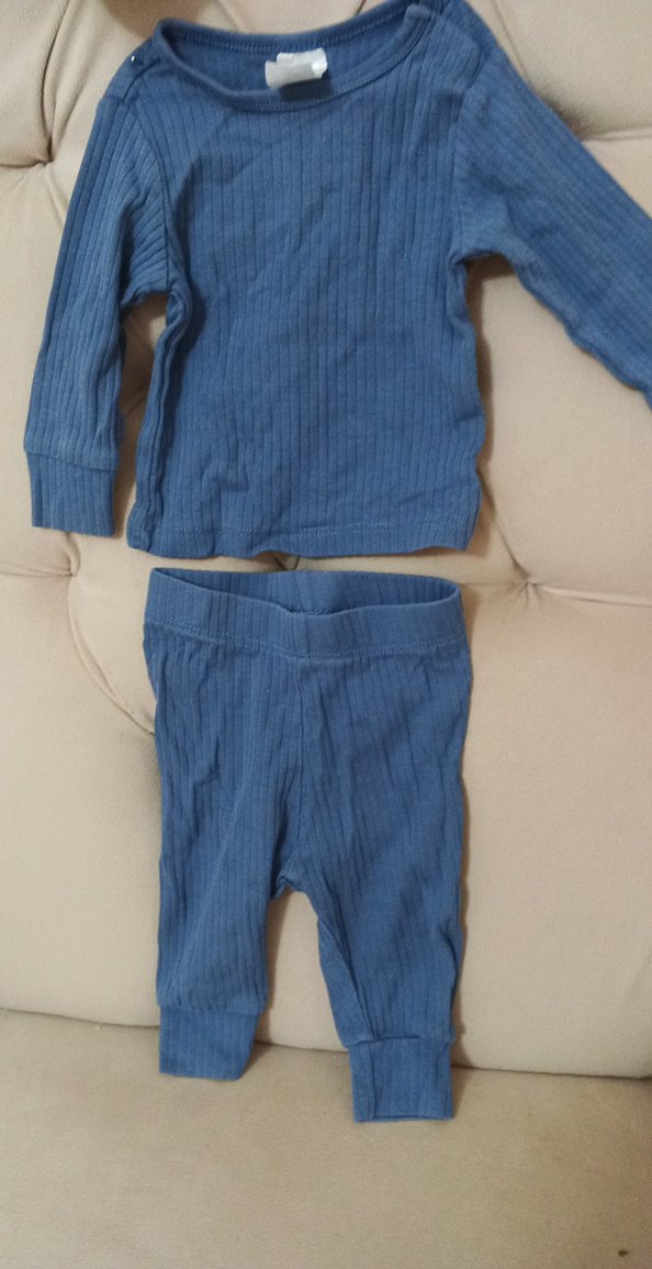 Uzun kollu, bisiklet yaka üst ve rahat denim kumaştan mavi pantolondan oluşan bebek takımı.
