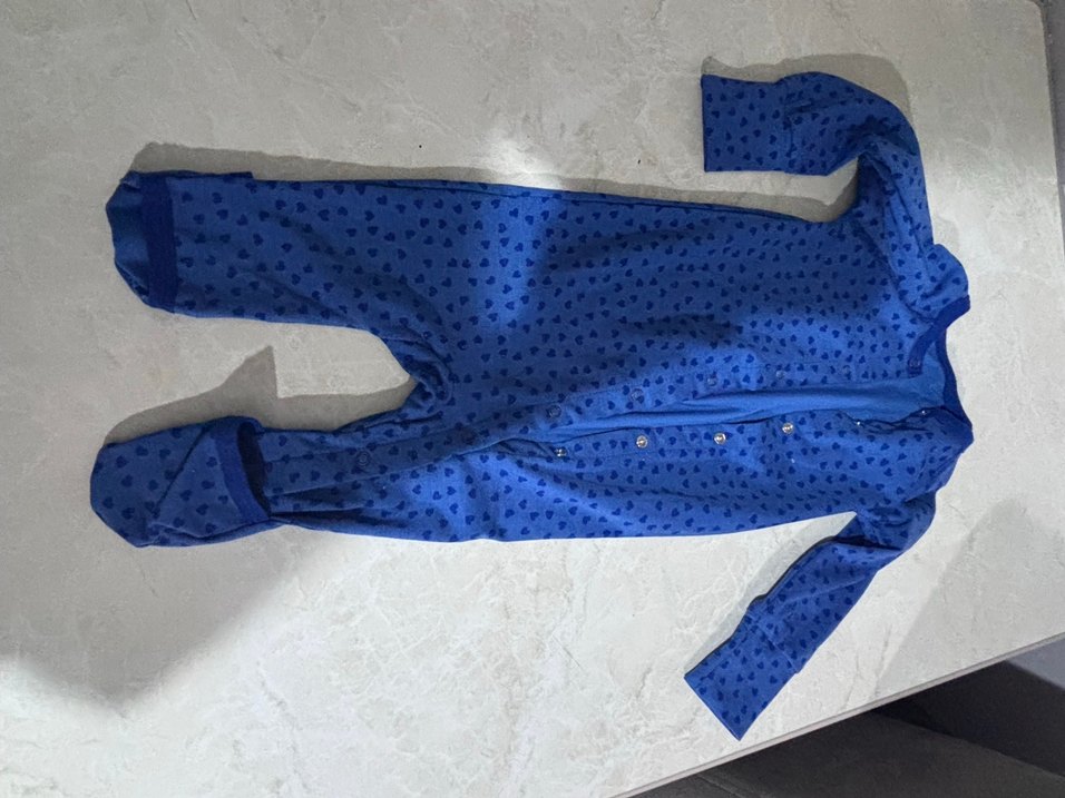 Renkli mavi bebek tulumu, uzun kollu, çentikli yakalı ve düğmeli. Yumuşak ve sıcak kumaştan, sokak stili için uygun.