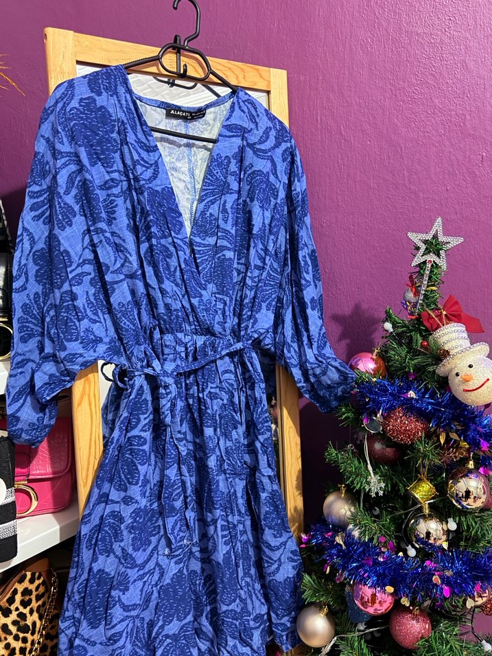 Uzun kollu, bol kesim mavi bohem elbise. Renkli batik deseniyle rahat ve akışkan bir tarz sunar.