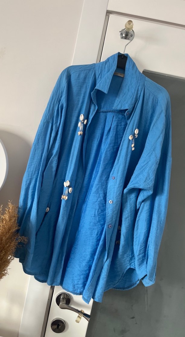 Uzun kollu, mavi keten gömlek, bol kesim ve yakalıdır. Düğmeli ön kısmı, nakış detayları ve parlak dokusuyla bohem tarzını yansıtır.