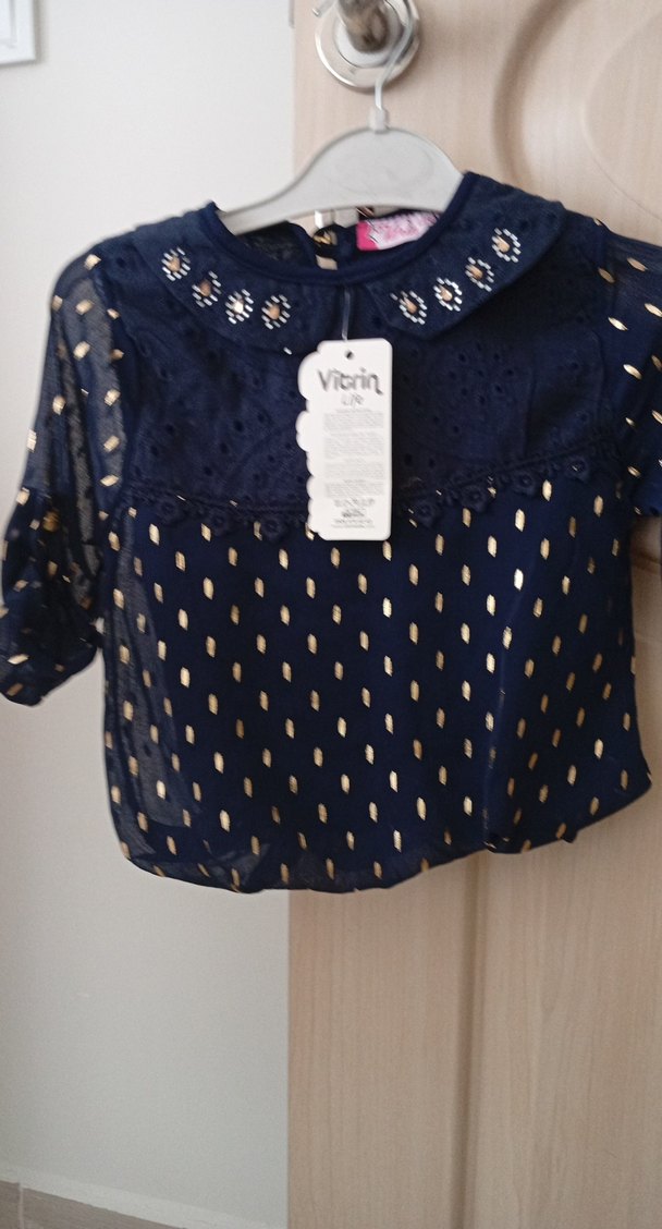 Uzun kollu, V yakalı, bol kesim mavi kız elbisesi. Parlak baskılı deseni ve düğme detaylarıyla bohem tarzda şık bir parça.