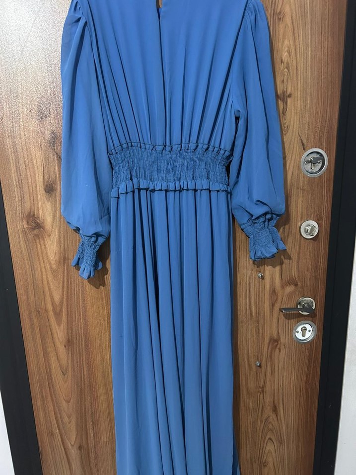 Uzun kollu, yüksek yakalı mavi elbise, piliseli detaylara ve bol kesime sahiptir. Bel kısmı toplanmıştır, romantik akşamlar için uygundur.
