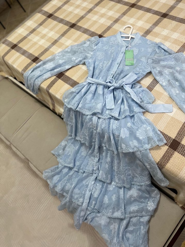 Yüksek yakalı, uzun kollu, yumuşak sentetik kumaştan yapılmış, bol kesim mavi uzun elbise. Baskılı desenlere ve fırfır detaylara sahiptir, bohem stil için uygundur.