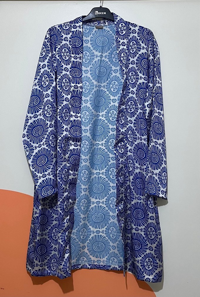 Bohem tarzda, uzun kollu, salaş kesim ve yuvarlak yakalı mavi renkli batik desenli kimono. Günlük kullanıma uygun, dökümlü tasarım içerir. Saten kumaş. Kitsun marka. Hiç kullanılmadı, sıfır ürün. Göğüs çevresi: 62 cm Omuzdan uzunluk: 100 cm Kol uzunluğu: 60 cm Kol açıklığı: 19 cm Etek ucu genişliği: 78 cm