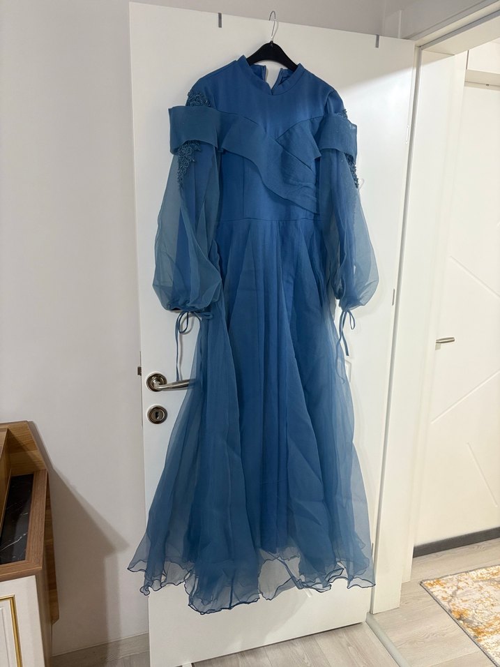 Uzun kollu, straplez yaka ve bol kesimli mavi bohem abiye elbise, drapeli detaylarla avant-garde tarzını yansıtıyor.