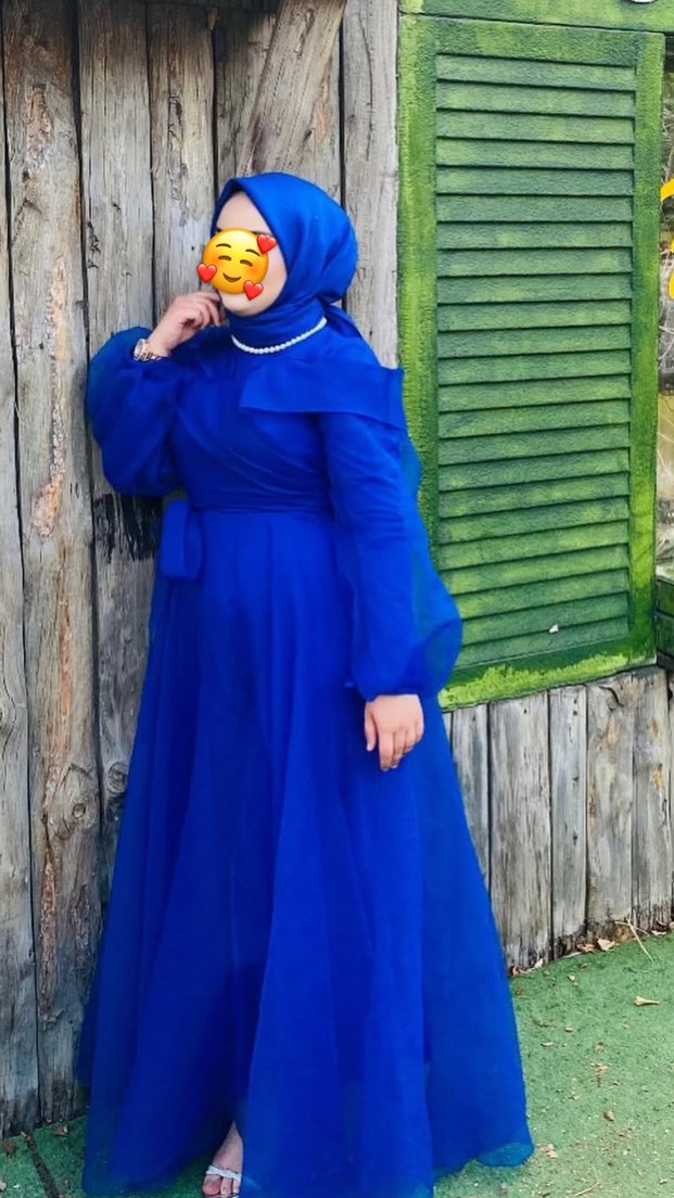 Uzun kollu, yüksek yakalı, bol kesim mavi abiye elbise. Drapeli tasarım ve renkli batik deseniyle düğünler için uygundur.