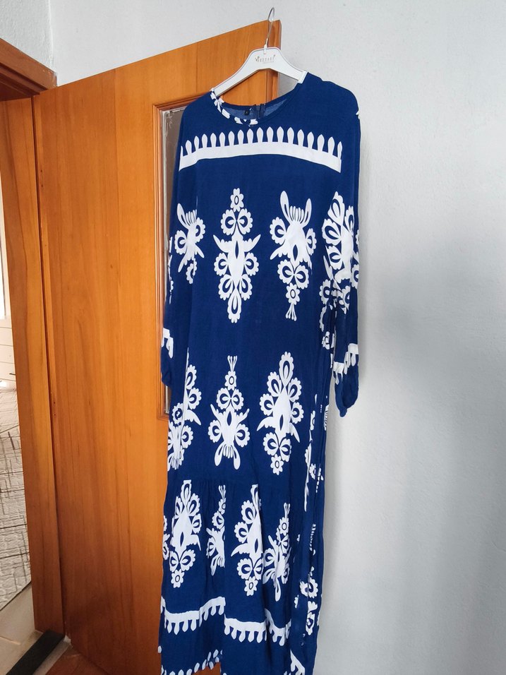 Mavi uzun elbise, bol kesim, uzun kollu ve fırfırlı detaylara sahip. Bohem tarzını yansıtan bağlama desenlidir.