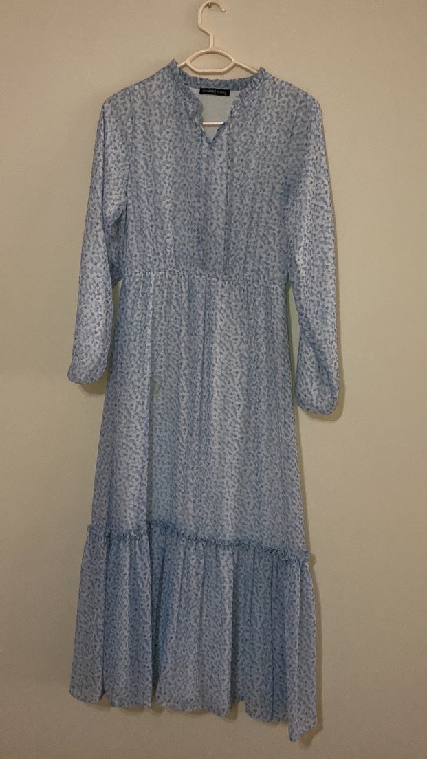 Mavi uzun elbise, yüksek yakalı ve uzun kolludur. Salaş kesimi, volan detayları ve batik desenleriyle bohem tarzını yansıtır. Yumuşak sentetik kumaştan üretilmiştir, günlük kullanıma uygundur.
