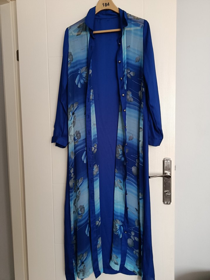 Uzun kollu, geniş kesim mavi elbise, ipeksi kumaş ve yakalı detaylarla bohem tarzda. Koyu tonlu batik desenlidir.
