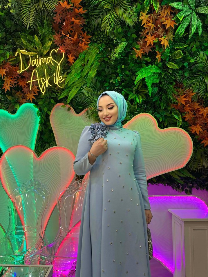 Uzun Kollu Mavi Bohem Zarif Abiye Elbise