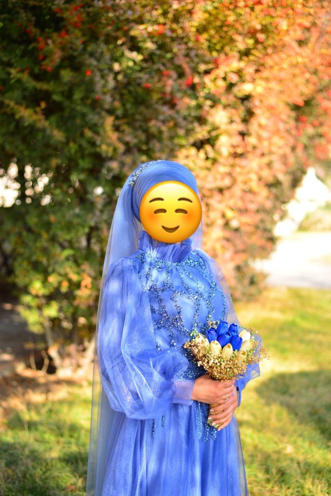 Uzun, vücuda oturan bu nişan elbisesi yüksek yakalı, uzun kollu olup pastel mavi tie-dye deseni ve drapeli detaylarıyla bohem ve modest bir tarz sunar.