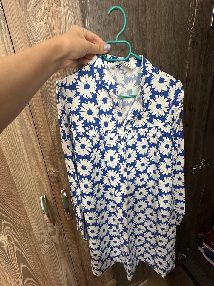 Uzun kollu, V yakalı, düğmeli ön kısmı ve beyaz çiçek desenli mavi bol kesim gömlek. Yumuşak sentetik kumaştan, günlük kullanım için uygundur.