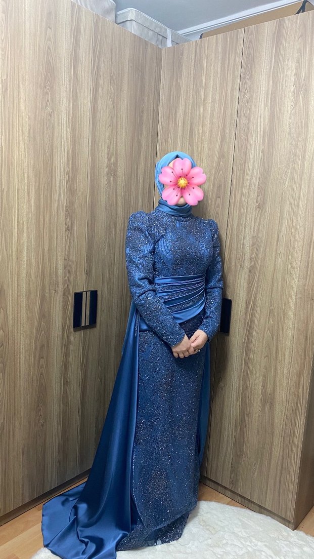 Bu uzun kollu ve yüksek yakalı abiye elbise, drapeli tasarımı ve koyu mavi indigo olarak ta geçiyor sayfamdaki bütün abiyeleri bir kere birkaç saat giydim yeni gibi emin olabilirsiniz