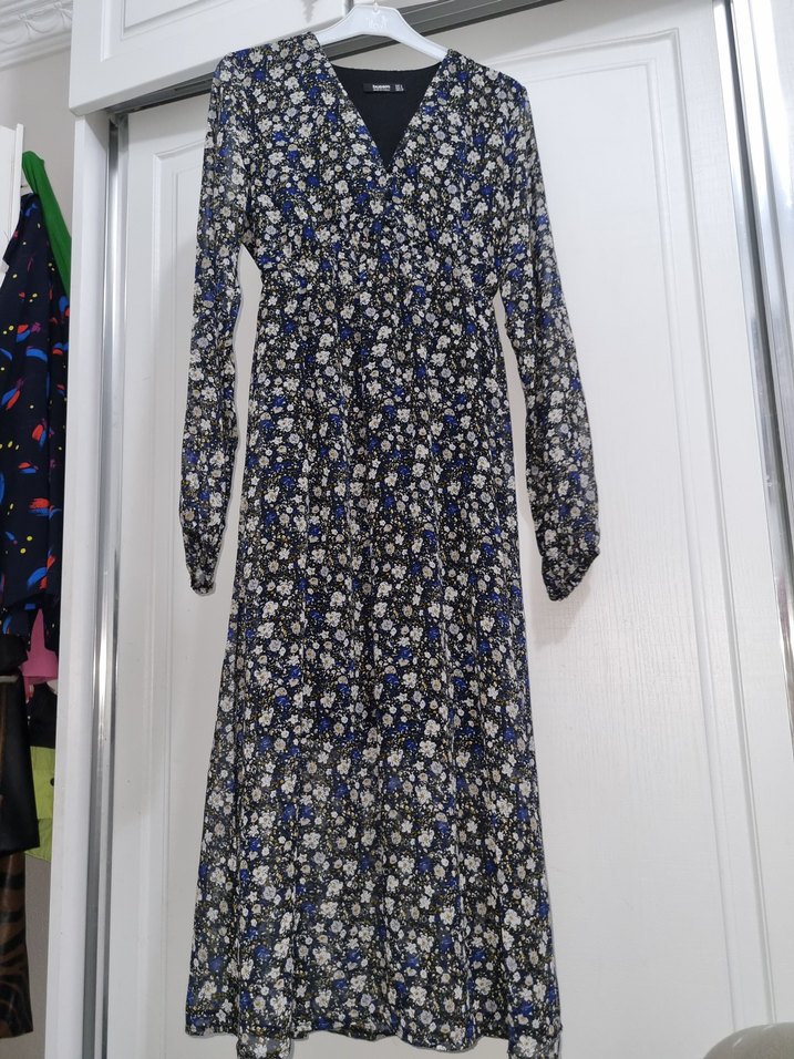 Uzun, bol kesim elbise koyu mavi çiçek desenli, drapeli ve V yaka detaylıdır. Uzun kollu ve gündelik bohem tarzda kullanıma uygundur.