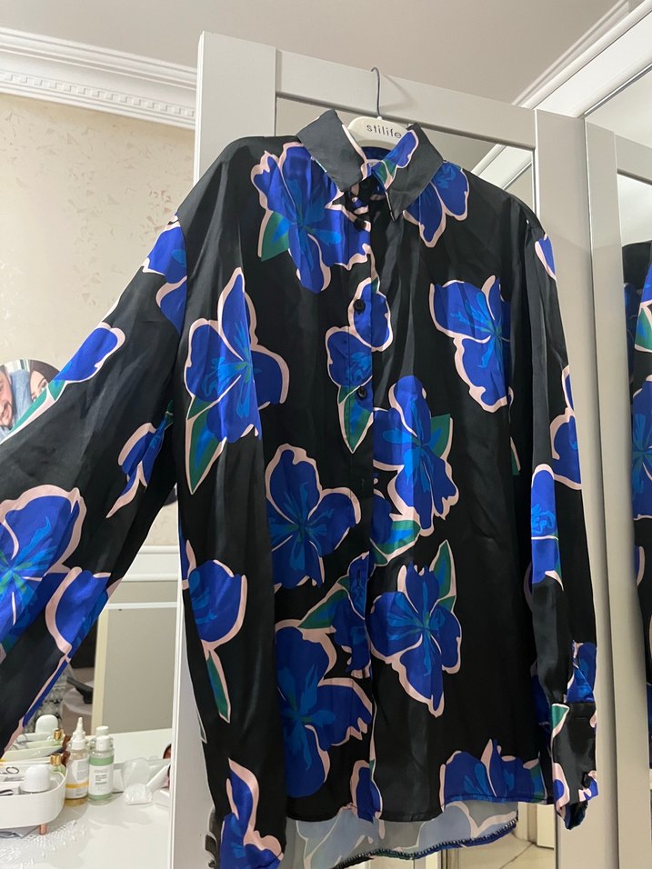 Uzun kollu, yakalı ve düğmeli kadın gömleği. İpeksi kumaştan, koyu zemin üzerine canlı mavi çiçek desenli, bol kesim.