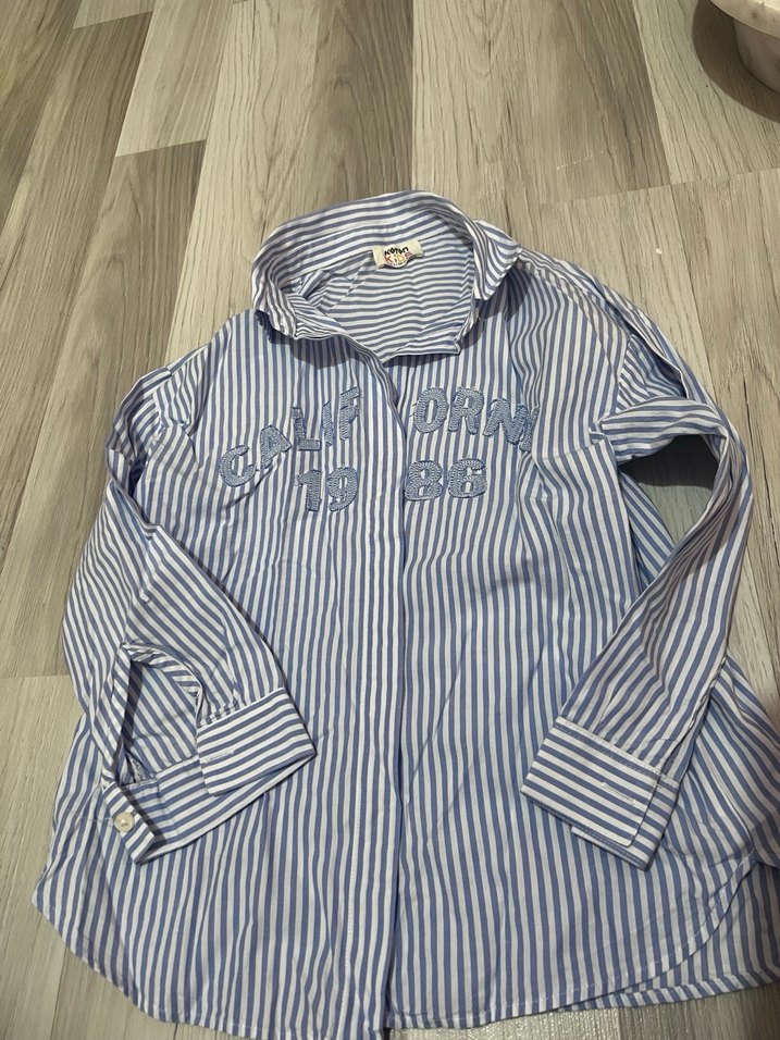 Düğmeli, yakalı, uzun kollu, mavi ve gri çizgili pamuklu, bol kesim gömlek, günlük rahat kullanım için uygundur.