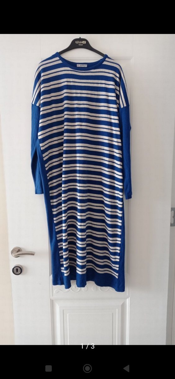 Uzun kollu, kayık yaka ve bol kesime sahip bu triko elbise; mavi ve gri çizgili, sentetik yumuşak kumaştan, drapeli tasarıma sahiptir.